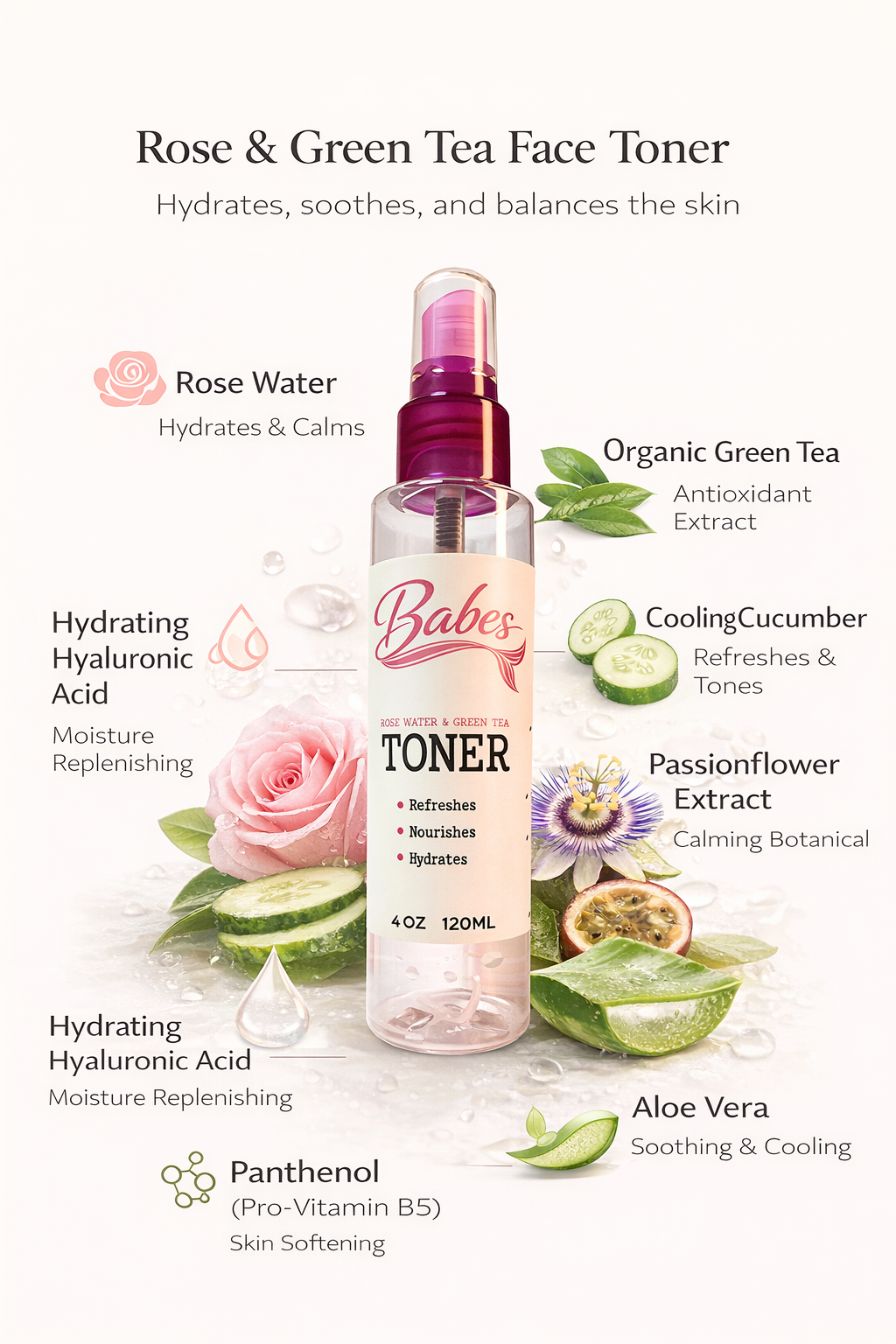 Formulated for lightweight hydration and a fresh, comforted finish, this Rose & Green Tea Hydrating Face Toner Base layers beautifully after cleansing. Rose water and organic green tea extract provide a soothing, antioxidant-rich boost, while aloe and glycerin help support everyday moisture. Organic cucumber and organic passionflower extracts add a calming botanical touch, and panthenol (Pro-Vitamin B5) plus hyaluronic acid help leave skin feeling smooth, supple, and refreshed.